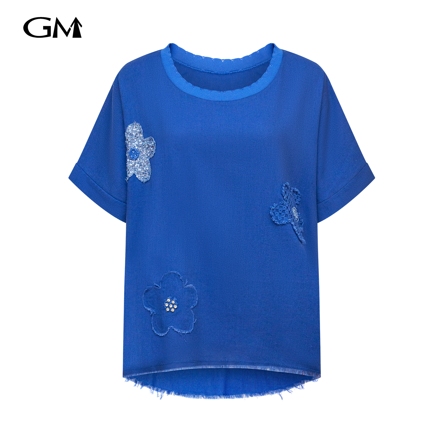 This top features a minimalist round neck design, short sleeves for a refreshing and neat cut, a solid color base with three-dimensional floral appliqués that add a playful artistic touch. The hem is treated with a silk-like frayed edge, exuding a casual and trendy vibe. Made from a carefully selected cotton blend fabric, it's soft, breathable, and doesn't feel stuffy. Whether paired with jeans or a skirt, this versatile piece effortlessly combines personality and leisure, making it an essential item for your spring/summer wardrobe. Five key features: Floral Appliques: Three-dimensional embroidered appliques that catch the eye with their details Hem Fraying: A fringed design adds street style flair Round Neck Short Sleeves: Basic silhouette that suits all body types Cotton Blend: Skin-friendly and breathable, providing comfort and durability Solid Color Versatility: Neutral tones easily adapt to various styles Outfit suggestions: Casual everyday: Pair with high-waisted jeans + canvas shoes Sweet girl: Wear with denim half-skirt + Mary Jane shoes Street trend: Layer with ripped jeans + dad shoes + baseball cap Minimalist commute: Wear with suit pants + loafers + tote bag Vacation style: Wear with straw bag + sandals + wide-brimmed hat